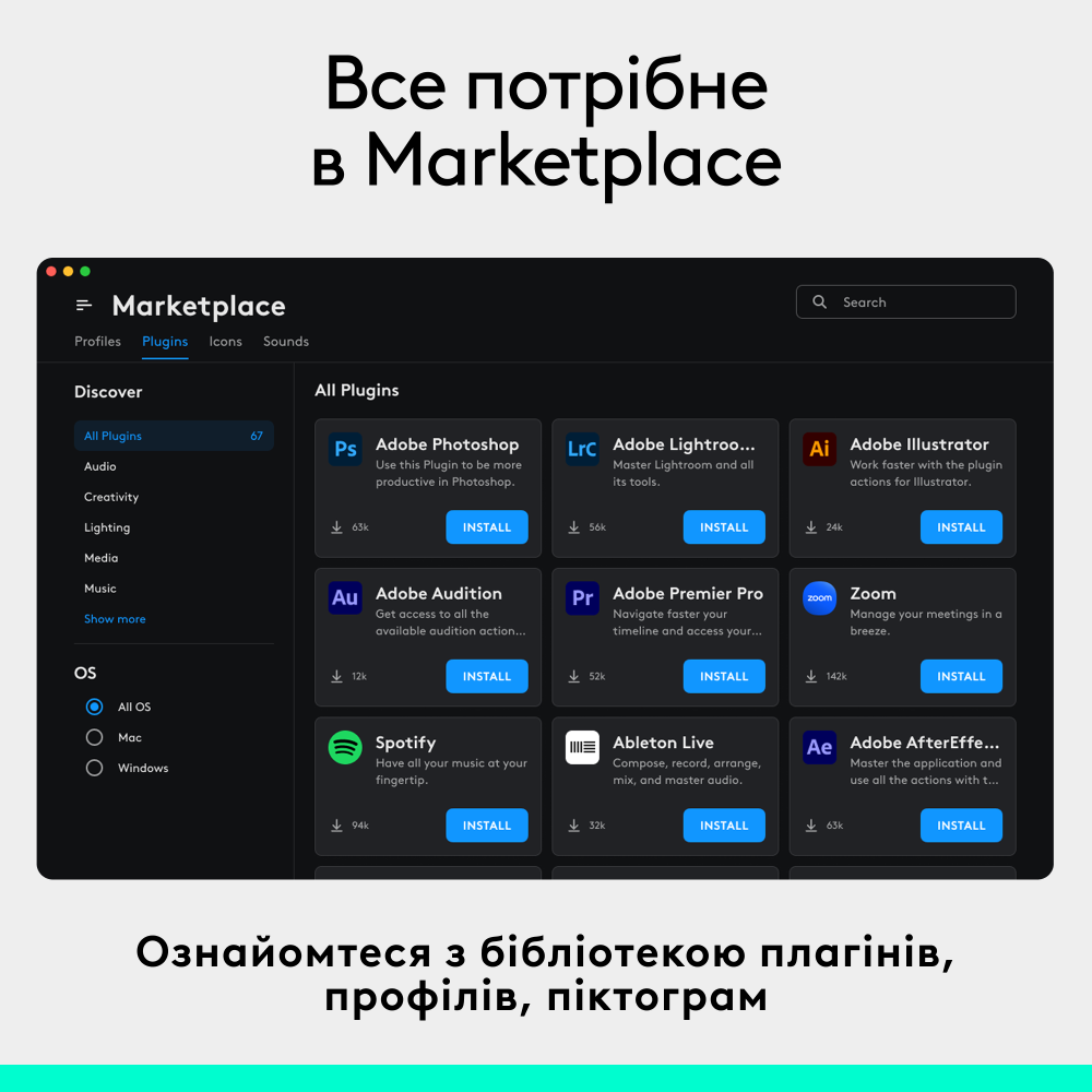 Безліч налаштувань у Marketplace Marketplace у програмі Logi Options+ надає вам доступ до сотень плагінів, шаблонів профілів, пакетів піктограм тощо.