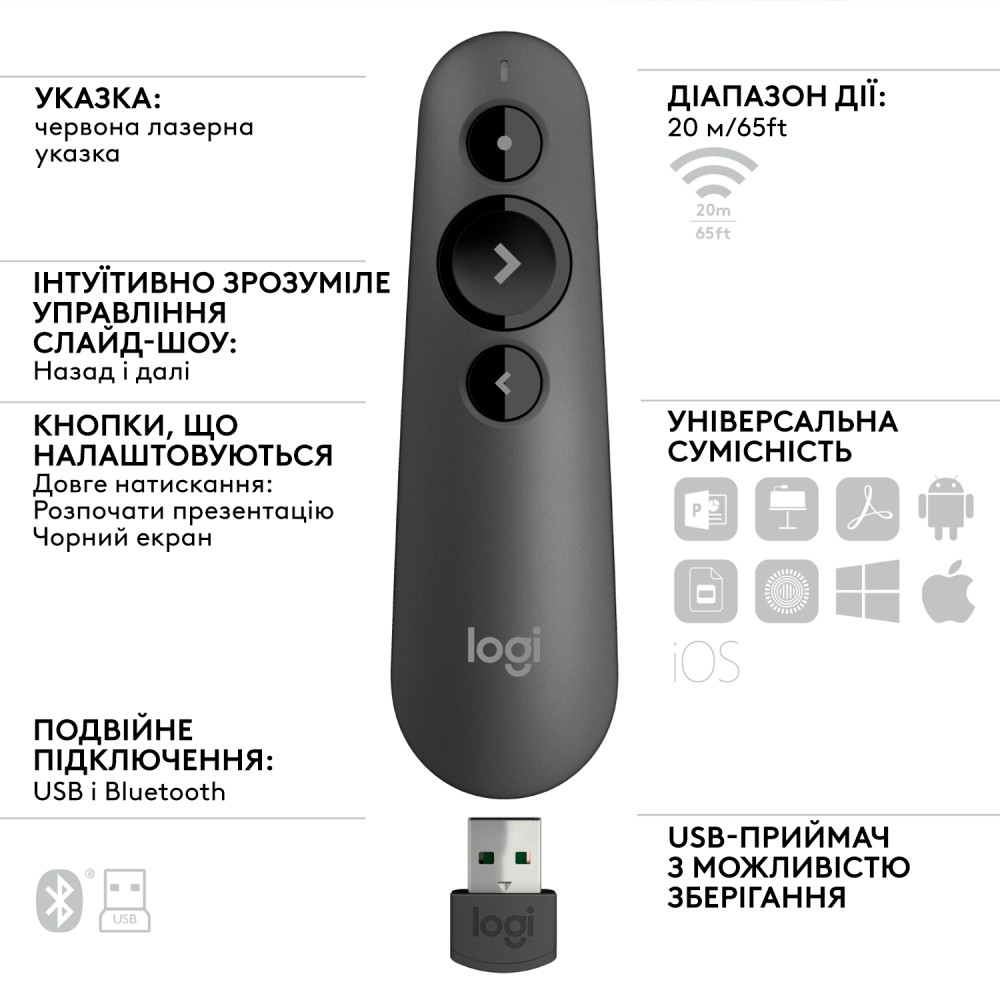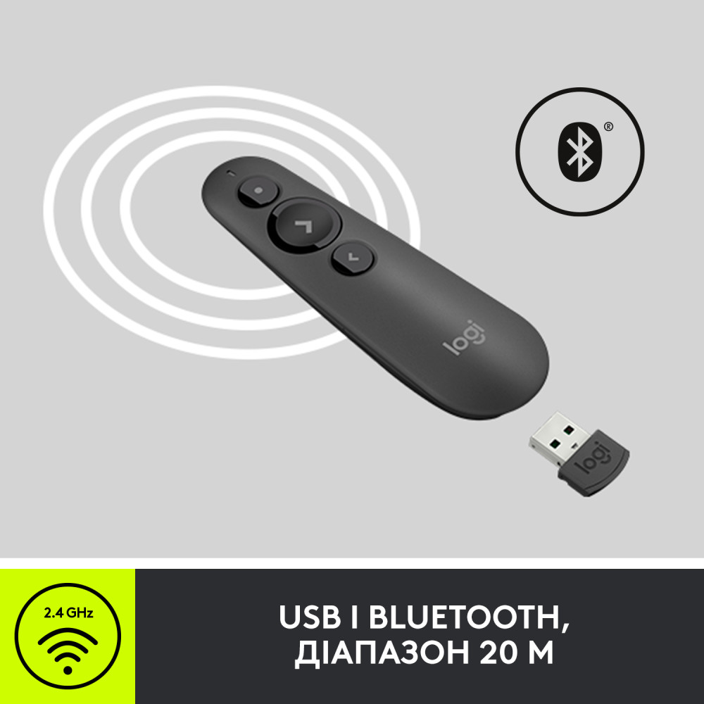 Приєднайте свій R500s до комп'ютера за допомогою USB-приймача або технології низького енергоспоживання Bluetooth®. Потім вільно рухайтеся та презентуйте з відстані до 20 метрів.