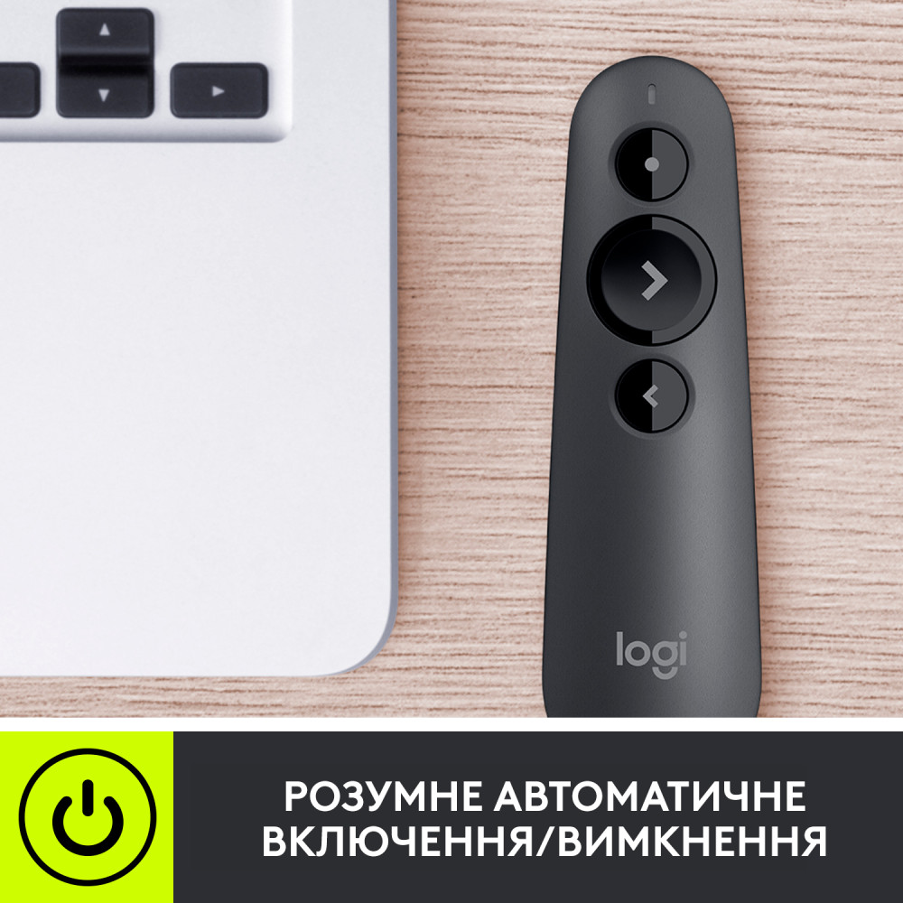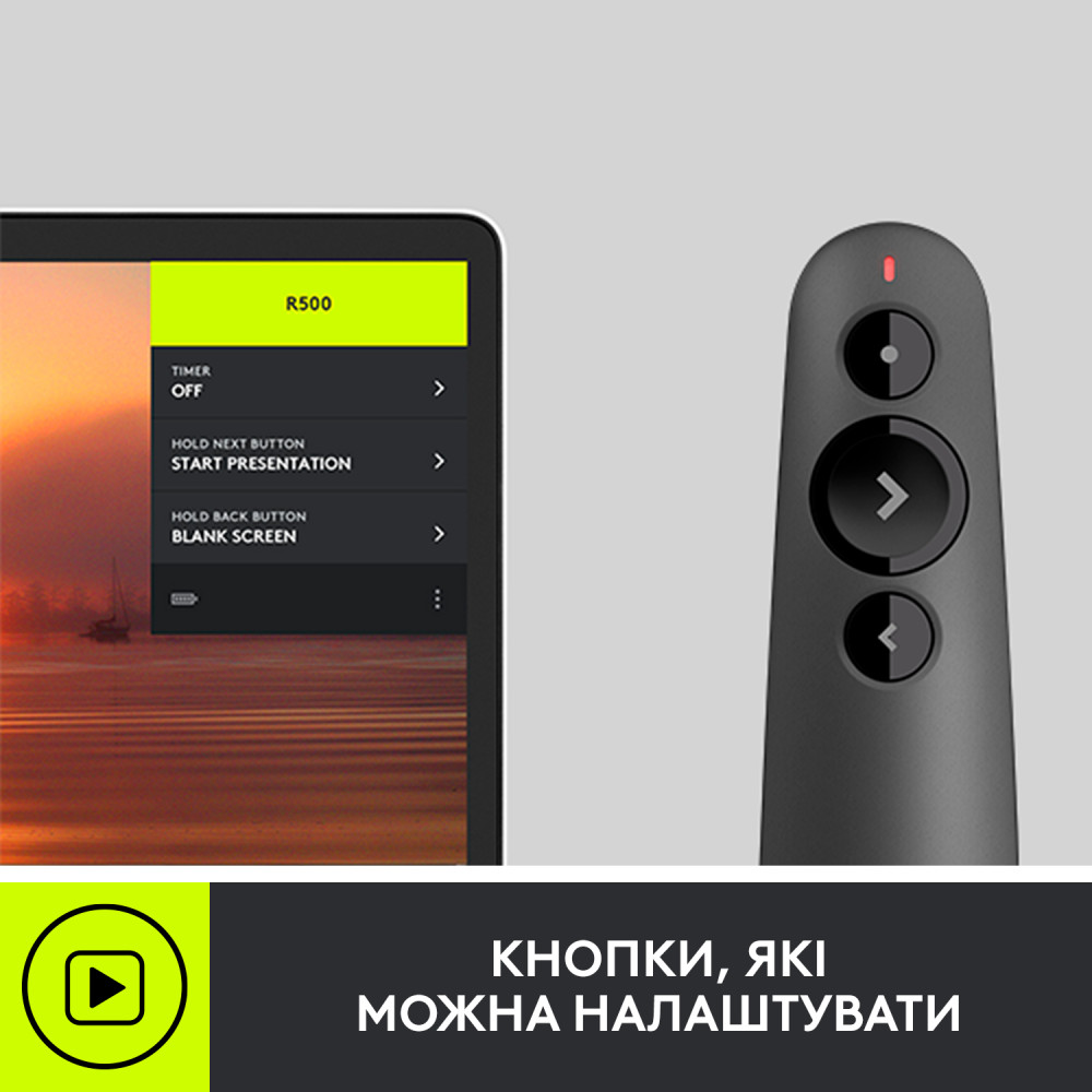 Однозначний дизайн R500s із трьома кнопками дозволяє легко та впевнено переміщатися між слайдами презентації, не опускаючи погляду, щоб орієнтувати пальці.