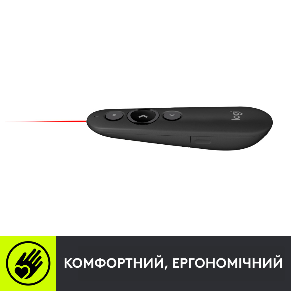 Лазерний пульт керування R500s був розроблений так, щоб точно вписуватися в долоні вашої руки. М'яка гумова поверхня та текстуровані кнопки забезпечують впевнене утримання під час презентації.