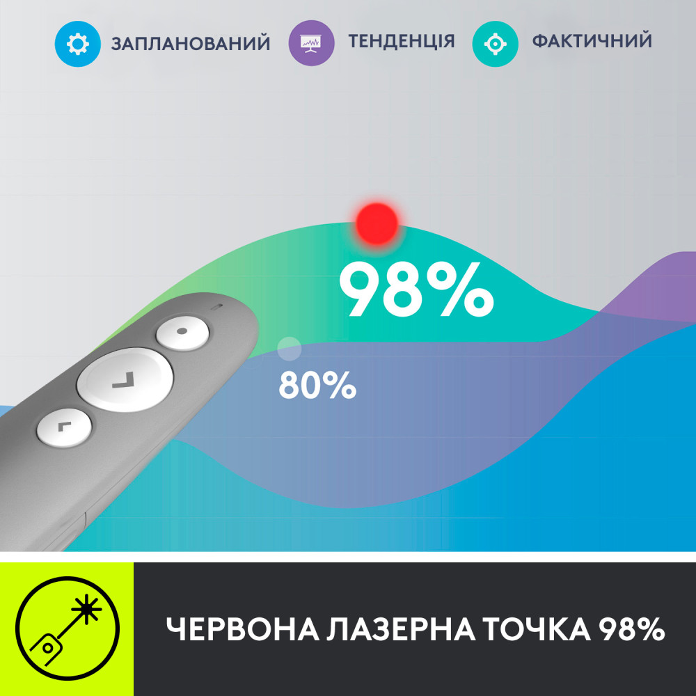Однозначний дизайн R500s із трьома кнопками дозволяє легко та впевнено переміщатися між слайдами презентації, не опускаючи погляду, щоб орієнтувати пальці.