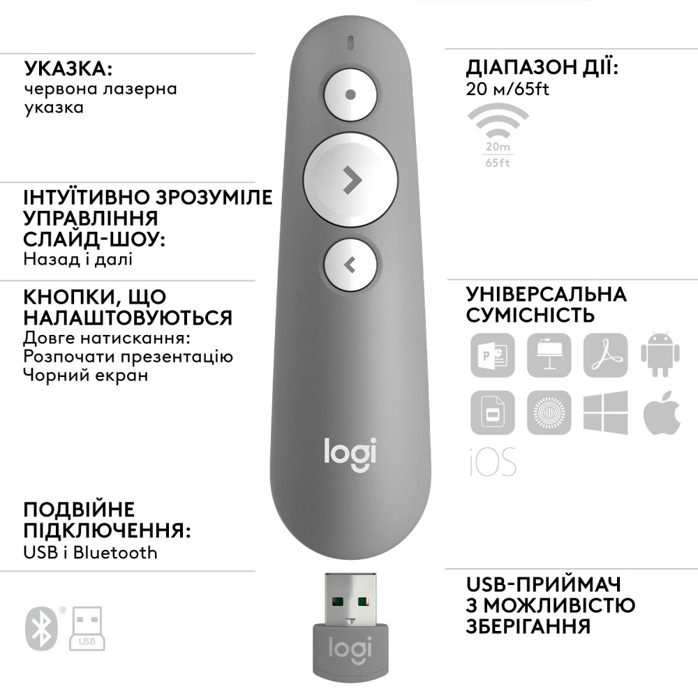 Приєднайте свій R500s до комп'ютера за допомогою USB-приймача або технології низького енергоспоживання Bluetooth®. Потім вільно рухайтеся та презентуйте з відстані до 20 метрів.